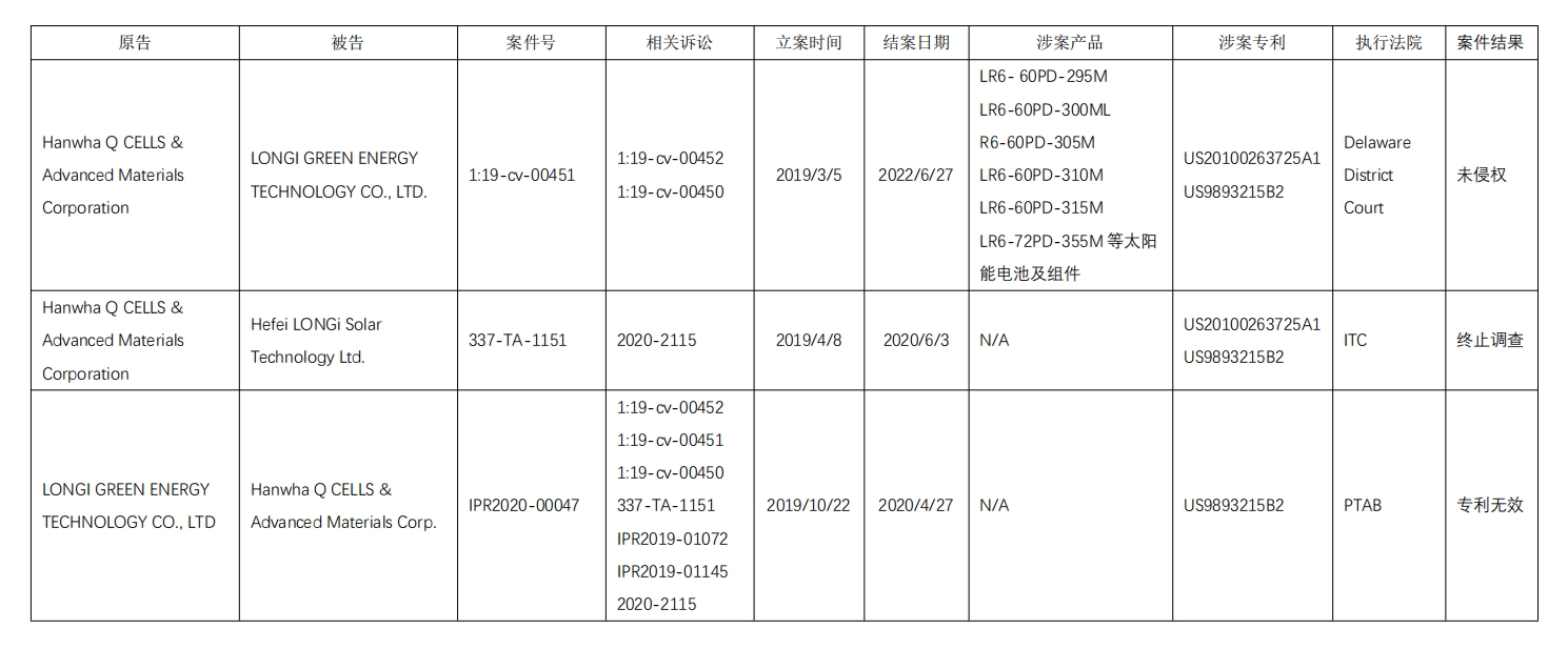 2020年6月,美国国际贸易委员会(ITC)发布337-TA-1151案最终调查结果,裁定隆基绿能的产品不侵犯韩华Q-Cells专利权(215号美国专利),未违反337条款,终止调查。同年7月31日,韩华就上述终裁结果提起上诉。次年7月9日,美国联邦巡回上诉法院终审判决维持原判。