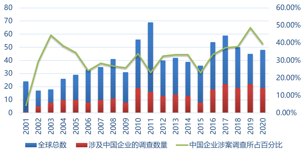 近年来,中国企业在美的知识产权纠纷呈现愈演愈烈的态势。美国337调查已成为继反倾销之后中国产品出口美国需面对的又一重大问题。中国已取代日本、韩国,成为遭受美国337调查最多的国家,尤其是2017年至2020年,每年涉诉美国337调查的中国企业涉案比例均在37%以上,涉案企业数量均在19家以上。
